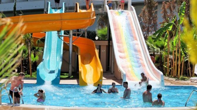 Практически вся территория занята двумя огромными взрослыми бассейнами, площадью 558 и 103 квадратных метра, и довольно вместительным детским бассейном, с небольшой горочкой в виде морского животного с фонтанчиками. Один из взрослых бассейнов с тремя большими водными горками, его глубина 1,2 метра. Их отключают днем с 12 до двух часов дня, и в пять вечера уже до утра. Бассейны чистые, хлорированные, детский обрабатывают в разы лучше, чем взрослый. У водоема есть небольшая терраска и бар, который работает до позднего вечера.
