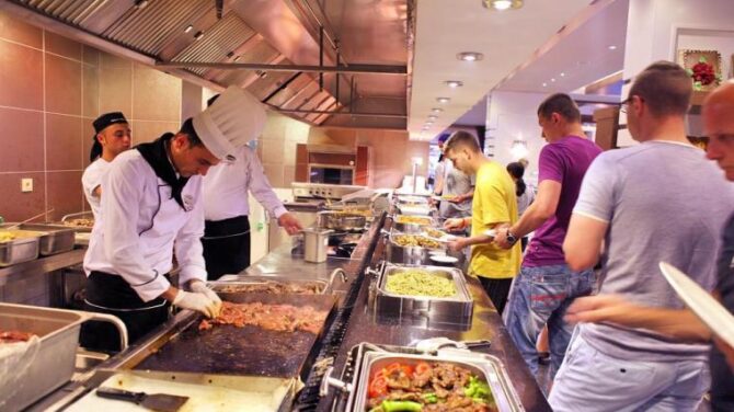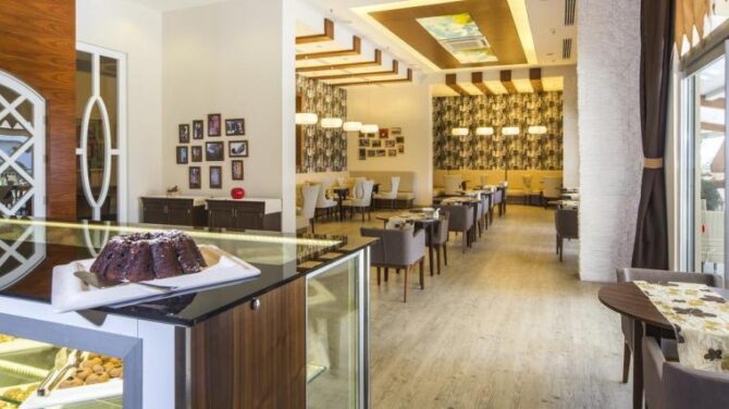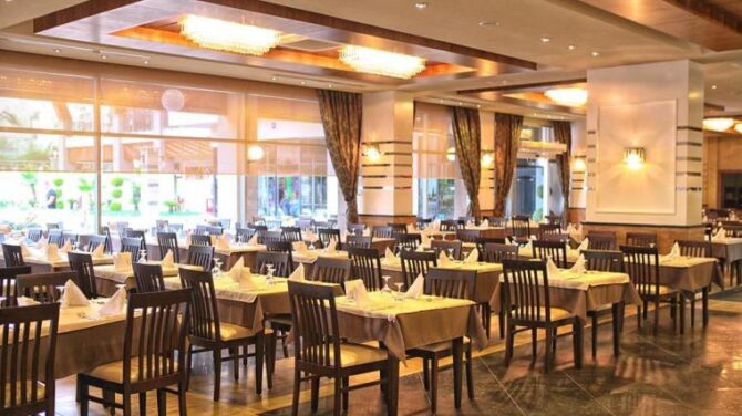 Питание по концепции шведский стол и «все включено». Оно разнообразное и вполне достойное, больше похоже на европейское, с легким налетом восточного колорита. Есть все виды мяса (кроме свинины) и птицы, гриль, шаурма, свежие и маринованные овощи, много зелени и йогуртов с различными начинками, супы, хлебные и кондитерские изделия, восточные сладости. Яйца подают в самых различных вариациях и видах – глазунья, омлет, вкрутую, пашот. Очень много свежих фруктов: бананы, апельсины, яблоки, арбузы, дыни, грейпфруты. В сиропе подаются персики, абрикосы и ананасы.