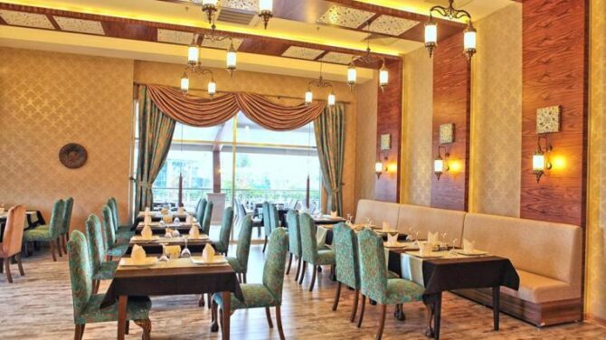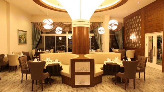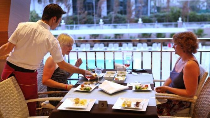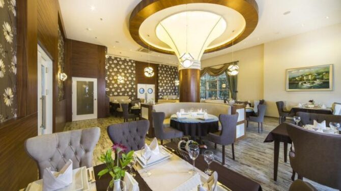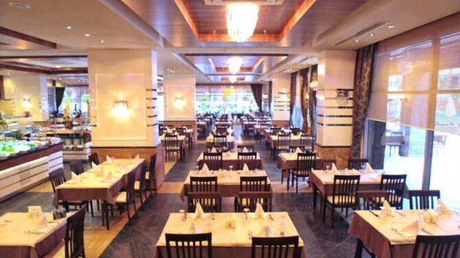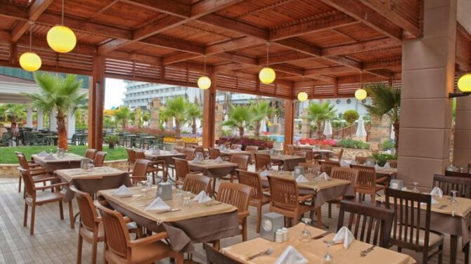 На территории отельного комплекса размещаются два ресторана: основной, часть столиков которого располагаются внутри здания, а часть выходят на террасу, и ресторан а la carte.