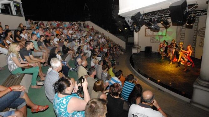 Анимация здесь ненавязчивая. Утром на бассейне проводят гимнастику и аквааэробику, на море на песке играют в волейбол, натянута сетка. Ежедневно вечером в амфитеатре проводят шоу с приглашенными артистами, каждый раз с разными: танцы, фокусники, акробаты, факиры. Раз в неделю устраивают турецкую ночь – тогда представление происходит у бассейна. Своей дискотеки у отеля нет, если захочется потанцевать, то придется выезжать в Аланью или Анталию.