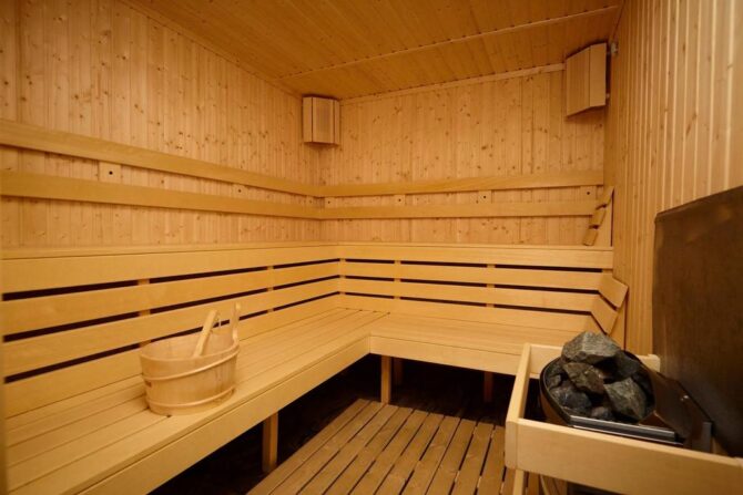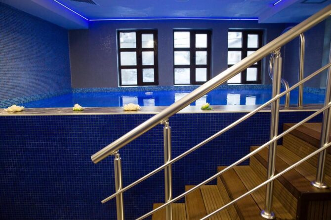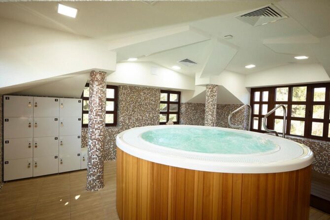 В распоряжении гостей — два бассейна с минеральной водой, паровая баня, сауна, массажные кабинеты.