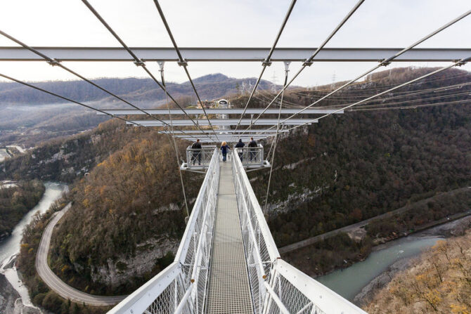 В парке Адлера можно прогуляться по необычному мосту Skybridge, который расположен на высоте 439 метров над рекой Мзымта. Этот мост считается одним из самых длинных пешеходных мостов не только в Краснодарском крае, но и на всей планете. И несмотря на то что прогулка по мосту абсолютно безопасна, эта часть парка точно зарядит адреналином. Эмоции на мосту гарантированы, так как это не обычный статичный мост: металлическая конструкция построена так, чтобы раскачиваться от порывов ветра и при ходьбе. Ну и конечно, в парке Адлера можно прокатиться на зиплайне. Зиплайн – это развлечение с умеренным экстримом, поэтому подойдет для многих посетителей парка. По правилам парка, прокатиться на зиплайне могут даже дети от 10 лет. Удобные крепления и небольшая скорость позволяют насладиться полетом, красивыми видами парка и получить заряд положительных эмоций.