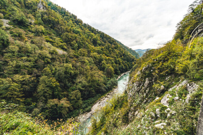 Внутри каньона также есть места, где река Мзымта резко поворачивает и расширяется, образуя живописные пляжи. На них можно загорать, купаться и отдыхать. Но и в самом каньоне Адлера много красивых вещей. Прогулка по правому берегу Мзымты доставит эстетическое удовольствие, а если за форелевым хозяйством свернуть налево, то можно выйти на смотровую площадку. Продолжая движение к Галицино, можно попасть в Ахштырскую пещеру, откуда открывается лучшая панорама каньона. Не отклоняясь от дороги, можно дойти пешком до национального парка — «Тещин язык».
