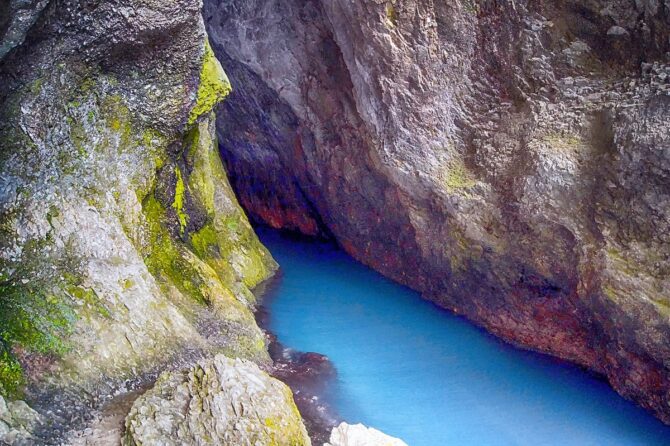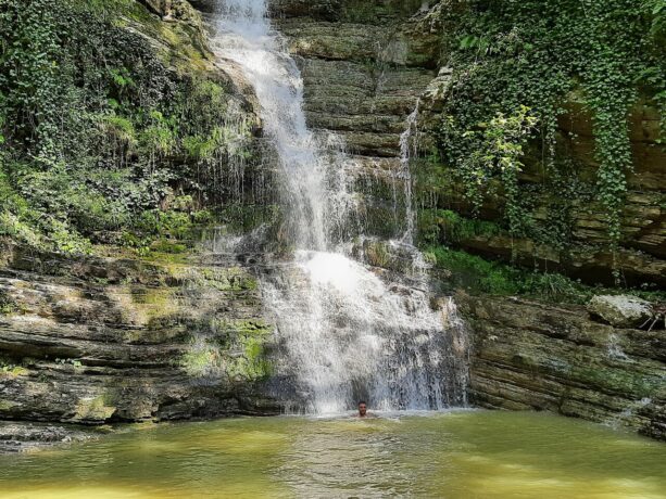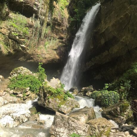 Также у подножия водопада есть бассейн, в котором теоретически можно плавать, но глубина небольшая и вода ледяная даже летом. И это неудивительно, так как река Глубокий Яр состоит в основном из вод тающих ледников. Ниже по течению, после бассейна между камнями, есть еще несколько небольших водопадов и водных горок. Рядом с этими водопадами можно посмотреть на руины храма-крепости IX века и пройти по экологической тропе Абаски. Правда, чтобы увидеть крепость и выйти на тропу, сначала придется взобраться на отвесную скалу.
