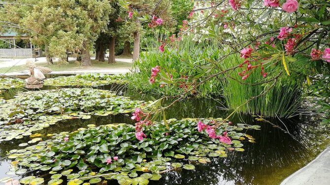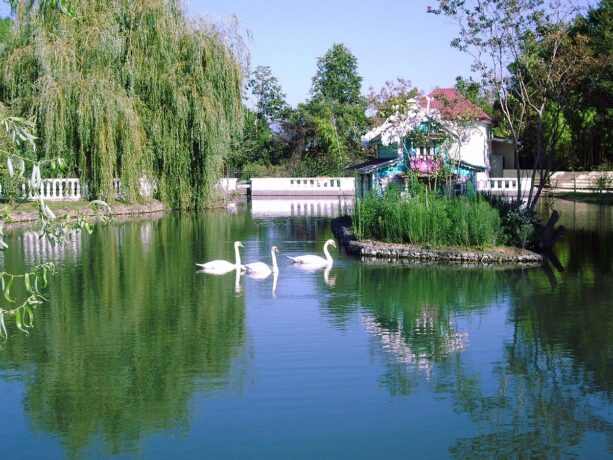 Посреди парка есть пруд, где на островках растут кусты и деревья. По мостикам парка можно пройти с одной стороны водохранилища на другую. По берегам растут черешня, бамбук, можно встретить цапель и лебедей. Парк заканчивается смотровой площадкой.