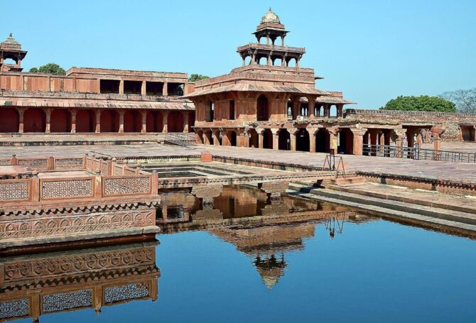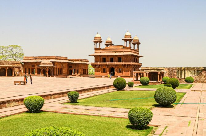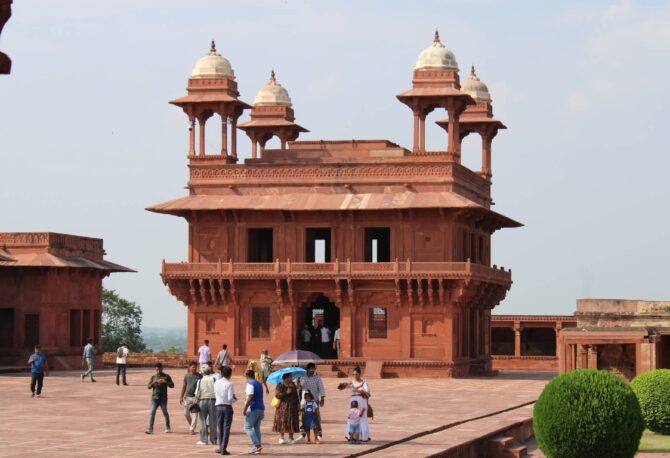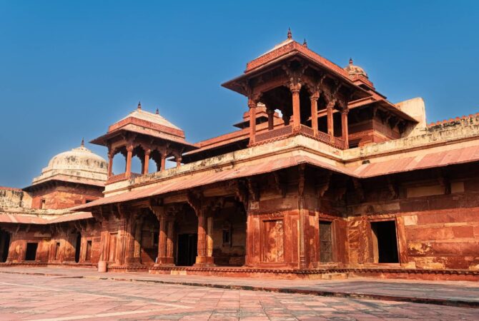 Исторически это была кратковременная, но впечатляющая столица империи – её возвели и покинули почти за десять лет, что придало Фатехпур-Сикри атмосферу заброшенной роскоши. Главные точки интереса — монументальный Buland Darwaza, мечеть, дворцы с резными балконами и священный мавзолей суфийского святого, привлекавший паломников.