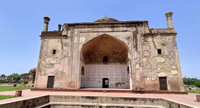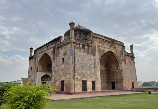 Краткая историческая справка. Построенная в XVII веке, усыпальница принадлежит персидскому поэту и чиновнику при императоре Шах-Джахане, её украшали изящные плитки и каллиграфия. Со временем цветная глазурь частично стерлась, и сейчас фасад выглядит будто бы слегка постаревшим и очень «живым» — не музейный блеск, а настоящая история под открытым небом.