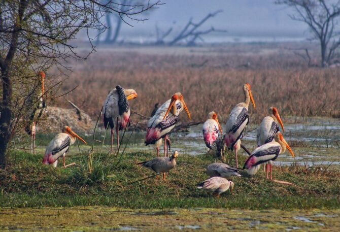 Национальный парк Кеоладео (Бхаратпур) уникален тем, что это искусственно созданные и поддерживаемые водные ландшафты, превращённые в одно из важнейших мест обитания перелётных птиц в Азии. Исторически парк возник как охотничьи угодья махараджи Бхаратпура, позже получил охранный статус и в 1985 году стал объектом Всемирного наследия ЮНЕСКО.