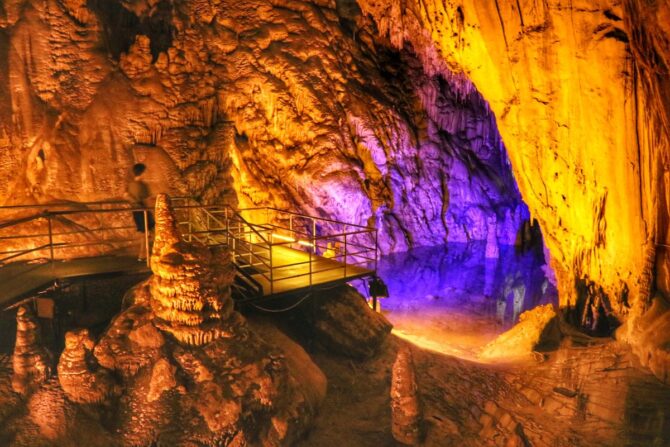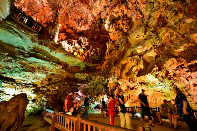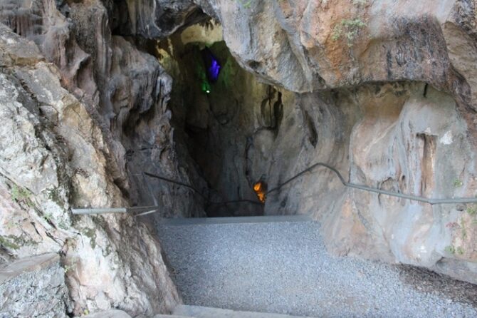 По дороге на каньон Сападере близ деревеньки Тырылар курортникам Аланьи непременно стоит посетить пещеру, чтобы оценить оригинальное «подземелье» и величественный вид Таврских гор. Она поделена на 6 залов. Здесь можно полюбоваться сталактитами и сталагмитами фантастических форм, карстовыми воронками и каменными «сугробами». Пещера имеет интересную подсветку, от чего получила прозвище «Радужная».