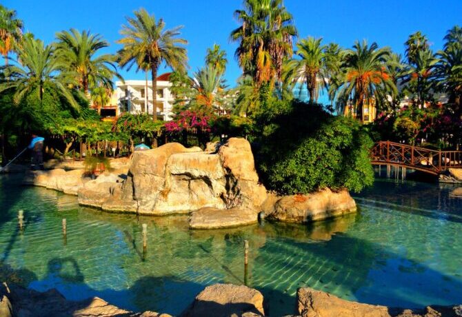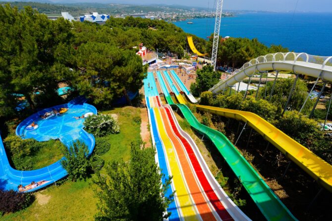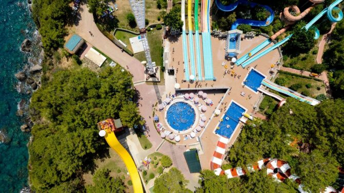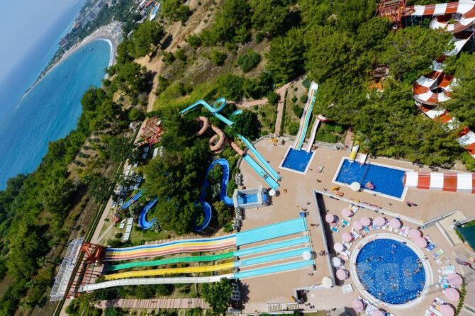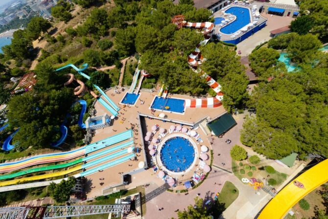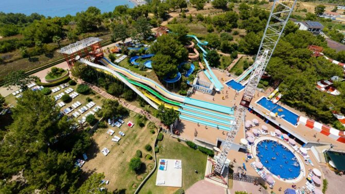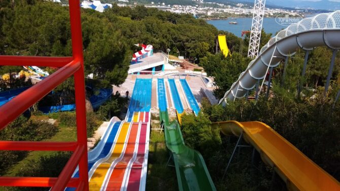 Расположен на территории одноимённого гостиничного комплекса. В нескольких километрах от города. Одним из плюсов аква-комплекса является его расположение: средиземноморское побережье с одной стороны и пышная зелень гористой местности с другой. Это крупнейшая аква-зона всего побережья. Его площадь вместе с гостиницей и прочими увеселительными местами составляет около 62 тыс. кв. м. К услугам посетителей аттракционы различной степени экстремальности: скоростные спуски, волновые бассейны, бассейны с вышками, искусственные водоёмы для рафтинга. Водные развлечения раскинулись на нескольких ярусах холма, а горки выставлены на склонах среди зелени. С самых высоких точек комплекса открываются невероятно красивые виды Средиземного моря. Фуд-корт водного комплекса представлен кафе и барами. В холодное время года аквапарк не работает.
