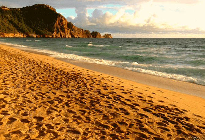 Пляж раскинулся на побережье неподалёку от выдающегося мыса, на вершине которого возвышается форт, датируемый XIII столетием. Протяжённость пляжа достигает 2 км. Он сплошь покрыт крупнозернистым песком, благодаря которому вода практически всегда прозрачная с лазурным оттенком. Вдоль комфортабельного пляжа удобно рассредоточились гостиничные комплексы курортного городка, различные точки общественного питания, спортивные площадки и детские городки с аттракционами. Здесь можно осуществить полёты на параплане, прокатиться на «банане», заняться воднолыжным спортом или арендовать катамаран. Пляж пологий, поэтому будет отличным вариантом для времяпрепровождения с детьми.