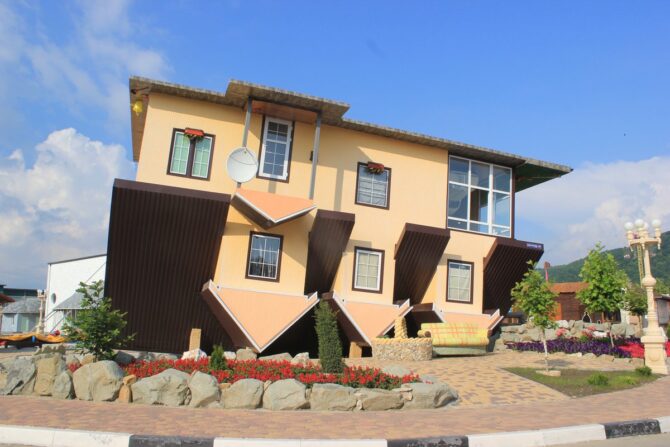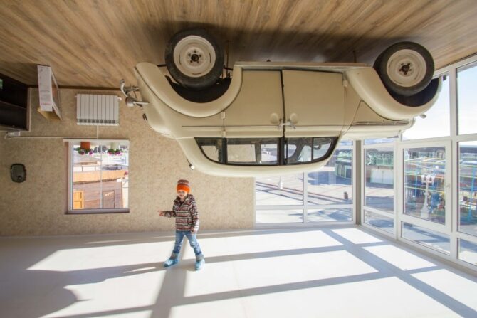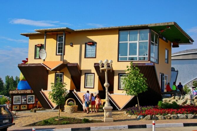 Необыкновенный дом расположился в центре Архипо-Осиповки. Сооружение невелико, порядка 100 кв. м. Однако вмещает в себе 2 этажа с обыкновенными комнатами, санузлом и кухней. Дом оригинален тем, что в основании его крыша и все предметы в нём расположены вверх тормашками. Поэтому гости дома вынуждены передвигаться по потолку, да и экскурсия по нему начинается с крыши, а заканчивается гаражом с настоящим автомобилем, расположенном на его втором этаже. Ещё одна изюминка странного дома – его возведение под углом 15 градусов. Таким образом создана иллюзия, что «потолок» убегает из-под ног. Однако находиться в доме абсолютно безопасно, поскольку построен в соответствии со всеми ГОСТами.