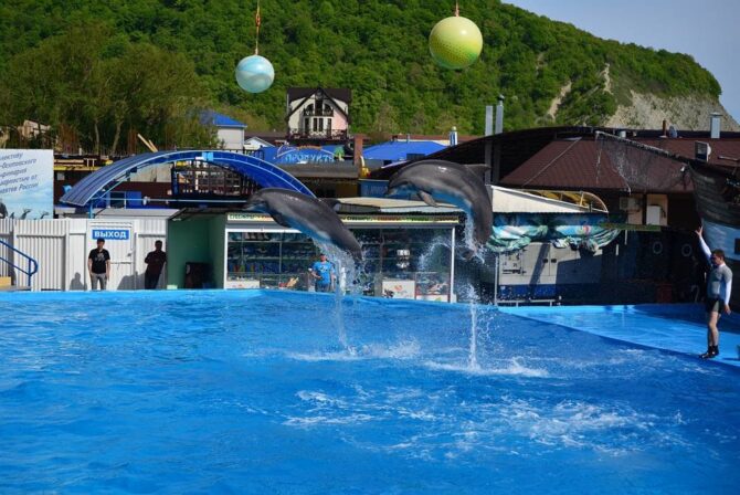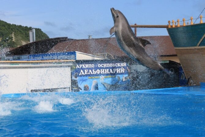 Замечательное место для летнего отдыха, где можно получить массу положительных эмоций. Дельфинарий в Архипо-Осиповке был открыт в 2006 году. На «сцене» водного театра – черноморские дельфины-афалины и морские котики. Дельфины – добросердечные и очень умные млекопитающие. Они могут передавать свою положительную энергетику людям, избавляя от депрессий и других недугов. Именно поэтому плавание с дельфинами считается невероятно полезным. Шоу-программа морского театра ориентирована на публику всех возрастов. Артисты поют, танцуют, показывают акробатические трюки и рисуют. После шоу можно сфотографироваться или поплавать с дельфинами. Акватеатр расположен в устьях рек Тешебс и Вулан практически на пляже Архипо-Осиповки. Поскольку дельфинарий находится на открытом воздухе, то представления здесь проходят только в тёплое время года.