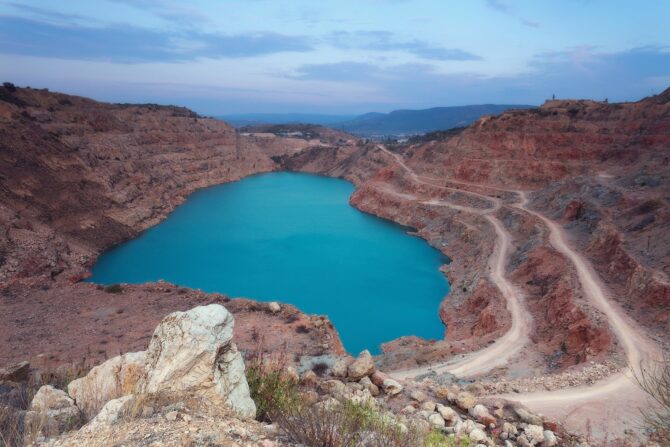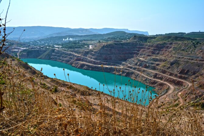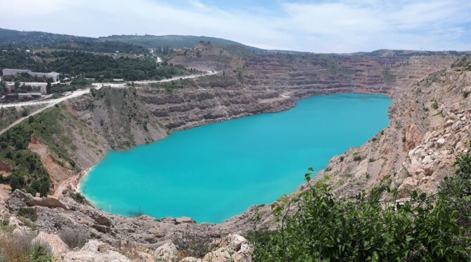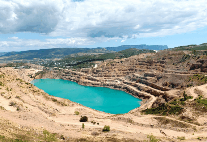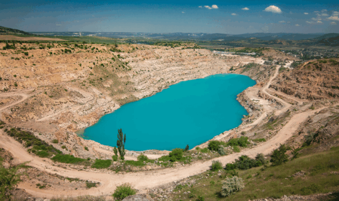 Ранее здесь добывался известняк, затем карьер забросили, и его котлован наполнился водой. Озеро называют Карьерным, потому что оно образовалось в карьере, а название самого карьера звучит также, как и близ лежащий населённый пункт. Сам карьер смотрится как декорация к какому-нибудь фантастическому фильму, а главной деталью, конечно же, является озеро, которое образовалось благодаря подземным водам и родникам. Озеро уникально, оно располагается ниже уровня моря (-14 м), и при этом оно довольно глубокое. Вода в озере необычная, она яркого цвета, в зависимости от погоды и высоты, выглядит синей, голубой или бирюзовой. Карьер и его озеро – это не туристическая зона, но любопытных всё равно много. Несмотря на то, что пейзаж в карьере выглядит мёртвым, жизнь здесь есть. Водная гладь озера нравится чайкам и бакланам, а туристы говорят, что видели здесь норы лисиц.