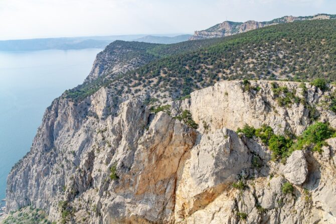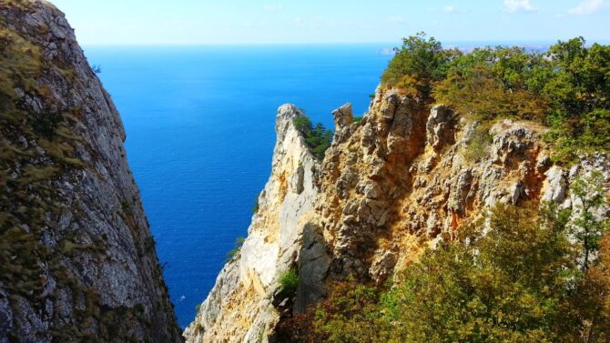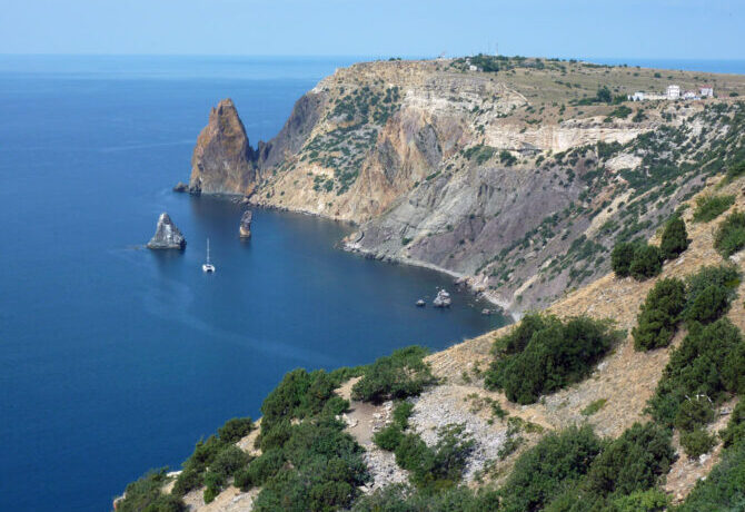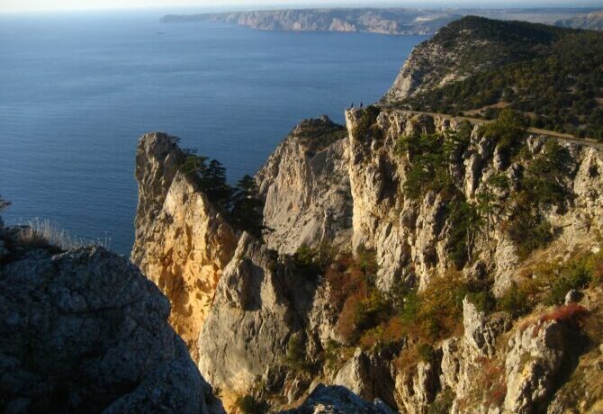Это самая высокая точка мыса Айя, расположена на юге Крыма на территории ландшафтного заповедника, в котором растут редкие растения и живут животные, занесённые в Красную Книгу. Климат здесь очень похож на Средиземноморский. Скала имеет высоту 558,5 м, известна тем, что на ней находятся руины древнего замка Кокия-Исар X-XIII вв. Даже сегодня на скале можно посмотреть на остатки оборонительной стены крепости, на руины часовни и башни. Голубая скала и другие скалы мыса Айя флот использовал для пристрела орудий. Место с неприступными скалами, покрытыми редкими растениями, очень живописно и не оставляет равнодушным.