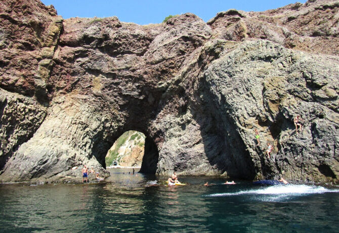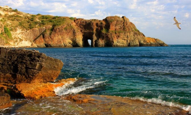 Находится на мысе Лермонтова (однофамильца русского поэта). Мыс представляет собой узкую вулканическую скалу с обрывами, которая выступает над морской стихией и имеет в центре грот, располагающийся на уровне моря. По легенде здесь располагалось древнее святилище богини. Грот очень красивый, увидеть его насквозь можно лишь с пляжа «Каравелла». Несмотря на то, что добраться до грота Дианы по суше невозможно, так как сверху находятся лишь неприступные отвесные скалы, а внизу грот полностью окружён морем, недостатка желающих его посетить не бывает. Здесь можно понырять, понаблюдать за подводным миром, полюбоваться прибрежными скалами.