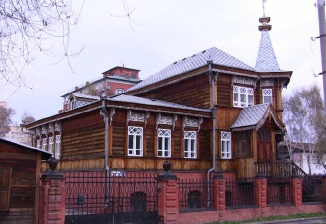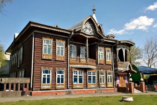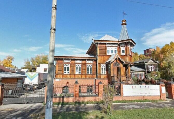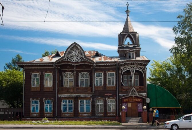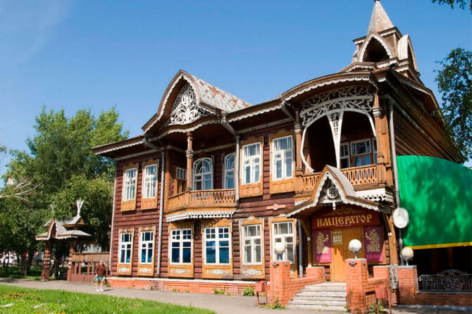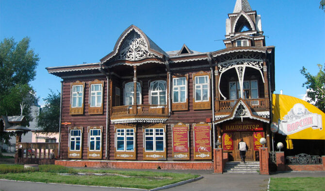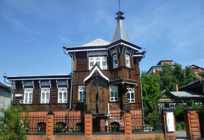 Бревенчатое здание выполнено в «П-образной» форме. Оно отличается живописностью объемно-пространственного решения. Это один из самых интересных примеров деревянного зодчества в Сибири. В экстерьере преобладает деревянный резной декор. Завершающим элементом стен является большой карниз с подзором и фризами. Деревянные декорации фасадов окрашены в два цвета желтая охра и белый. Желтая охра была использована для оформления наличников, колоны, фриз, ограждений балконов, лобовых досок карнизов. В белом цвете представлен весь накладной декор и декор из пропильной резьбы.