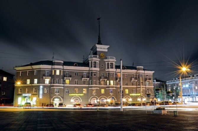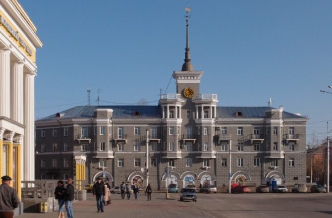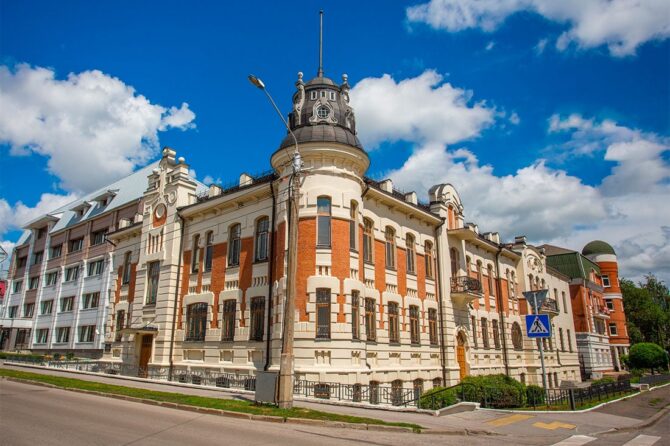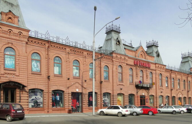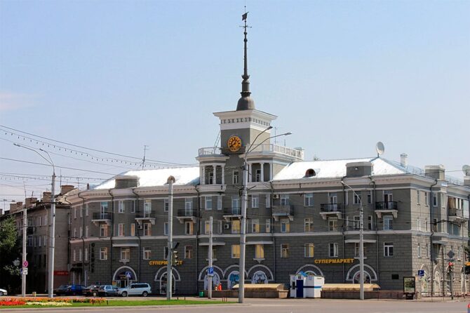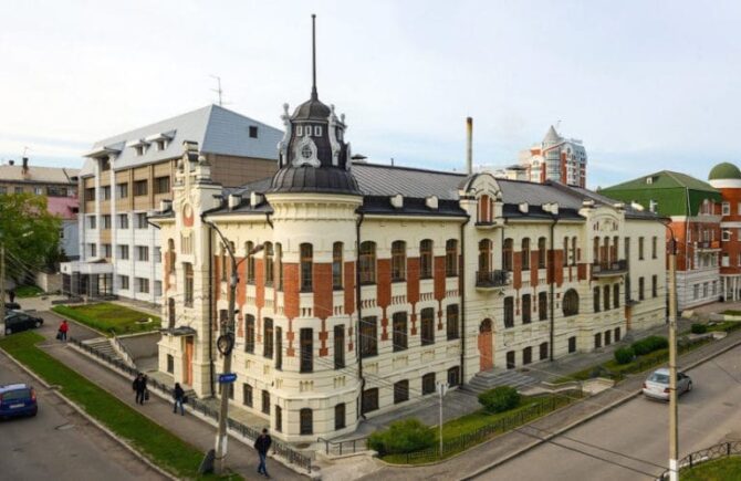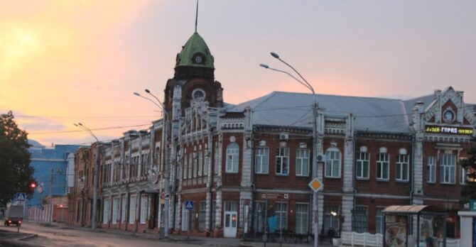 Архитектурный памятник Барнаула, который до сих пор сохранился в хорошем состоянии. Его строительство датируется 1914-1916 годами. Архитектор проекта И.Ф.Носович. В свое время в здании располагалась городская общественная библиотека. На первом этаже находился универсальный магазин, а на втором – городская дума и управа. Узнать здание городской ратуши можно по красно-белому фасаду. Его украшает башня для курантов. Сами же куранты были куплены в Санкт-Петербурге, в магазине швейцарских часов. Из города также привезли большие зеркальные стекла, чтобы ими украсить витрины первого этажа. Сейчас во внутренних помещениях расположены магазины и музей «Город».