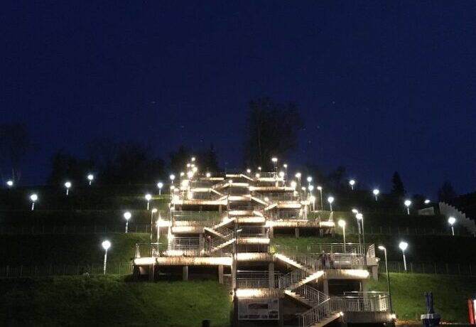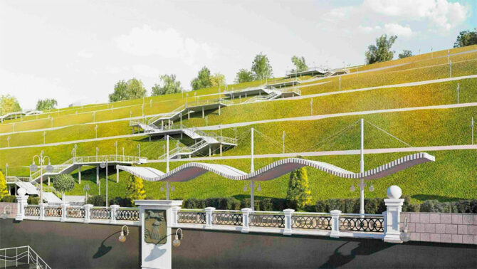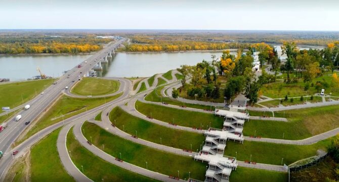 По лестнице отдыхающие спускаются к набережной, которая относится к современным достопримечательностям Барнаула. Несмотря на то, что в эксплуатацию ее сдали лишь в 2018 году, набережная успела завоевать популярность среди местных жителей и гостей столицы. Полукилометровая зона отдыха имеет современный дизайн, здесь установлены лавочки, теневые навесы. Прогулочную зону освещают фонари, а украшают ее вазоны с цветами. Изящные ограждения с коваными решетками гармонично вписываются в дизайн набережной, которая составляет единый комплекс с Нагорным парком.