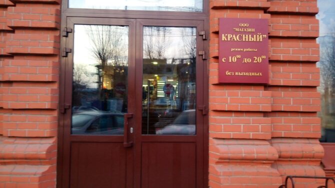 Здание магазина построено из красного кирпича, отчего он получил свое название. Выполнено оно в архитектурном стиле эклектики, который сочетает в себе национальный русский стиль, орнамент из фигурного кирпича и кованные металлические детали. На уличных фасадах установлены шатровые башенки, со стороны двора все фасады выполнены в виде глухих стен без какого-либо оформления. Чтобы попасть во двор магазина, нужно было проехать через кирпичные ворота с декоративными башнями. Эти ворота, кстати, хорошо сохранились и до наших дней.