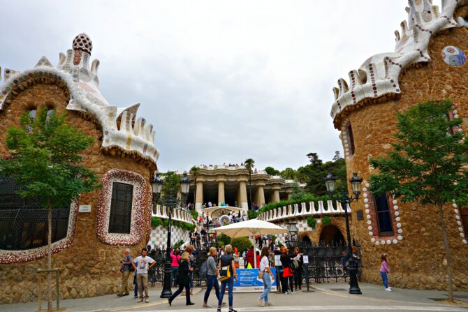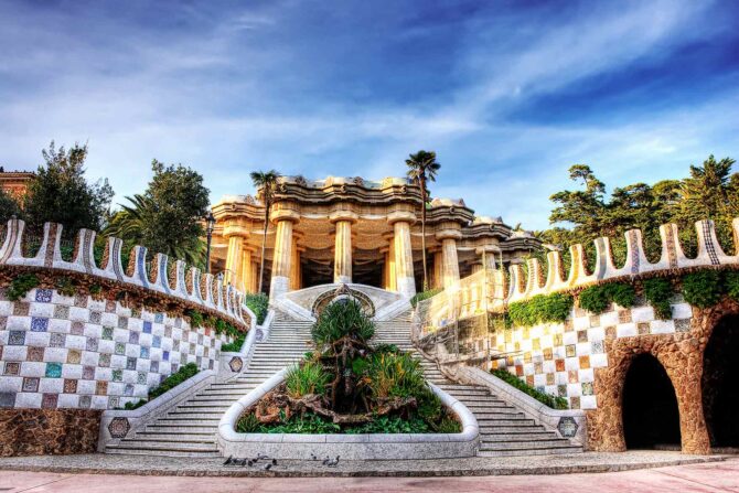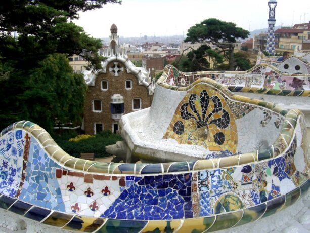 Парк Гуэль – любимое место отдыха горожан и гостей Барселоны. Здесь можно посидеть на знаменитой извилистой скамейке, посетить фальшивый замок и его зал со 100 колоннами, сфотографироваться на фоне мозаичной саламандры. Вся архитектура парка напоминает о любви Гауди к извилистым, плавным линиям – неровные дорожки, округлые перила и лестницы, волнообразные галереи.