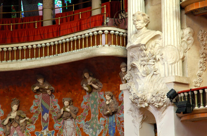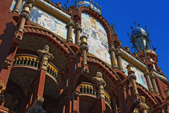 Построенный в начале 20 в., Palau de la Musica Catalana восхищает своей неповторимой архитектурой, над которой трудился знаменитый архитектор Льюис Доменек. Он сумел соединить в единый ансамбль множество декоративных элементов, скульптурные группы и оригинальные, замысловатые формы. Фасад здания украшают окна, обрамленные колоннами и витражные панели.