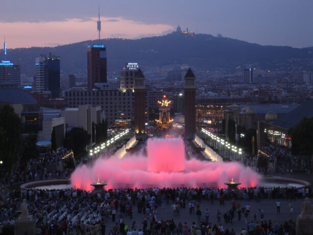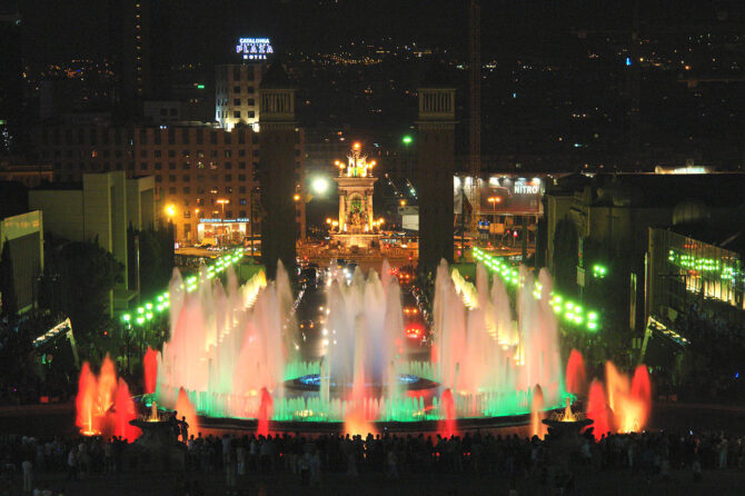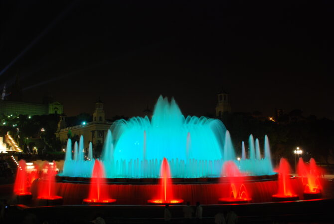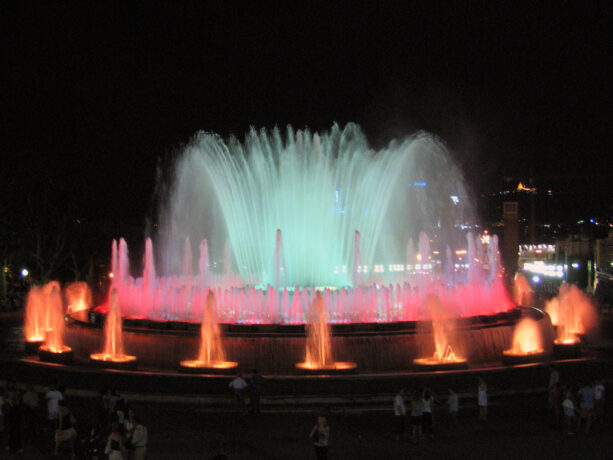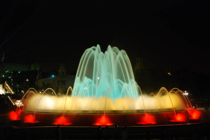 Знаменитое действо проходит по вечерам, а его длительность не превышает 20 минут. Когда на город спускается вечерняя тьма, фонтан приобретает неповторимый, загадочный и магический вид, переливаясь всеми цветами радуги и наполняя площадь вокруг него узнаваемыми даже иностранцами звуками мелодий. Огромный фонтан, площадь которого около 3 тыс. кв. метров, находится в Монжуик рядом с Национальным дворцом.