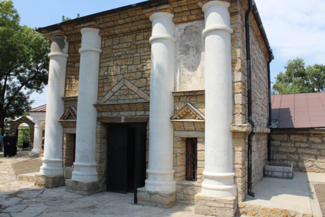 За несколько метров от греческой церкви надо найти скверик, за оградой которого виднеются две достопримечательности. Одна — странная приземистая постройка с «приплюснутым» классицистическим портиком. Он пришла из XIX века, а вот здание, которое «украсили» им, — это армянская церковь еще начала XVI в. Древнейшую ее часть, которая имеет вид базилики, наполовину утопленной в землю, можно увидеть с тыльной стороны здания. Перед порогом, по армянской традиции, пол вымощен могильными плитами — считается, что только тогда, когда надписи них сотрутся под ногами верующих, умершим простятся грехи. В стены вмурованы несколько резных крестов-хачкаров. Попасть внутрь храма вряд ли удастся. Он, хотя и передан церковной общине, стоит закрытым — видимо, ждет ремонт.