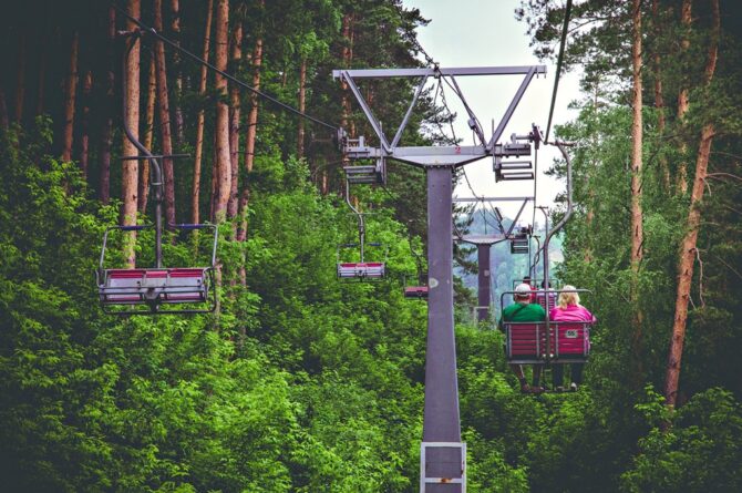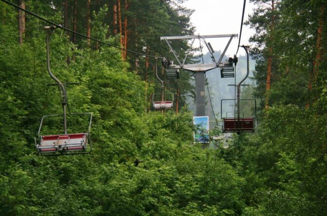 В полутора километрах от Водяной мельницы стартует канатная дорога на гору Церковка. Стало доброй традицией проехаться по ней, чтобы сверху осмотреть окрестности. Канатка поднимает на высоту 850 метров. Отсюда открываются панорамные виды на весь курорт. Дорога функционирует круглогодично. Летом по ней поднимаются любители уникальных фотосессий, пеших прогулок по скалам, туристических походов. Зимой подъемник обслуживает горнолыжные спуски. Стоимость билета составляет 400-600 руб. в зависимости от сезона, дети до 6 лет катаются бесплатно. Подъем занимает около 25 минут. Проложены специальные тропы для пешего восхождения. Предположительное время прогулки – 1-3 часа.