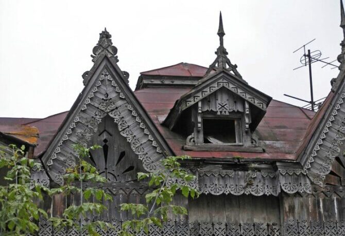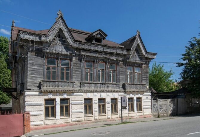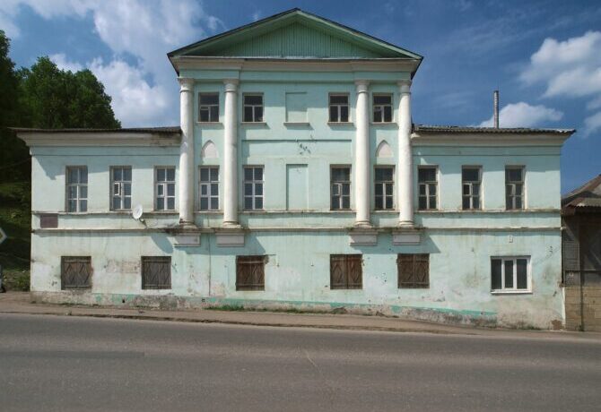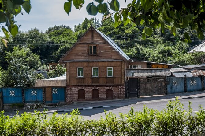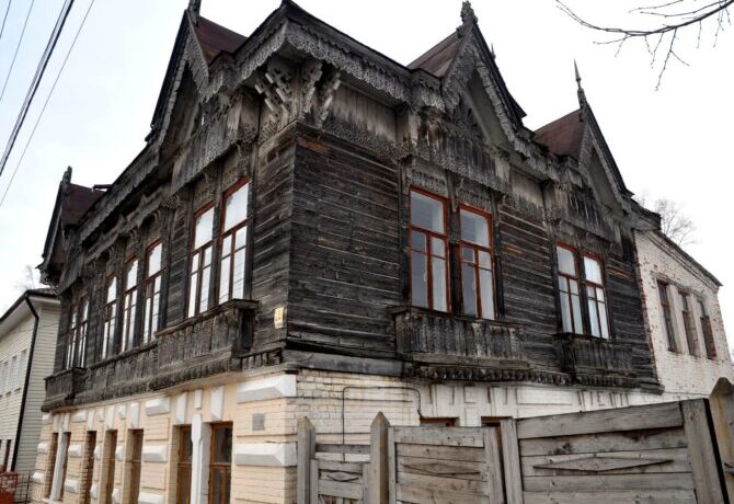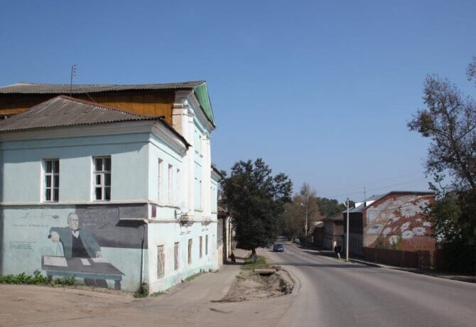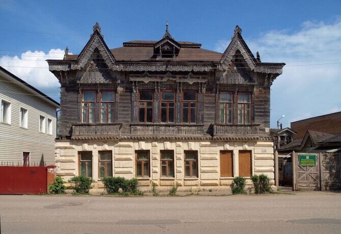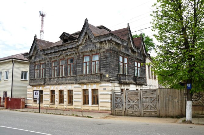 Дальше путь пройдет по улице Ленина. Здесь находится несколько интересных построек. К одной из них относится деревянная усадьба купца Шокина. Вернее, деревянные кружева оформляют верхний ярус дома. Нижняя часть с фундаментом сделана из камня. Здание было построено в 19 веке и одно время считалось самым красивым в городе. Сейчас, если поспешить, то можно сделать фотографии исторического дома, пока он окончательно не развалился. Горожане обвиняют власти в халатности по отношению к этому памятнику архитектуры. После революции в нем какое-то время находился детский сад. Сегодня работает выставочный зал с работами боровских мастеров-ремесленников, проводятся мастер-классы по изготовлению тряпичной куклы и куклы из природных материалов (глины, дерева).