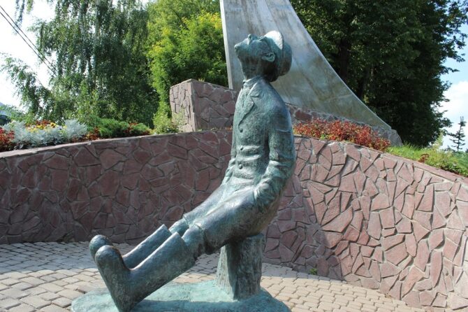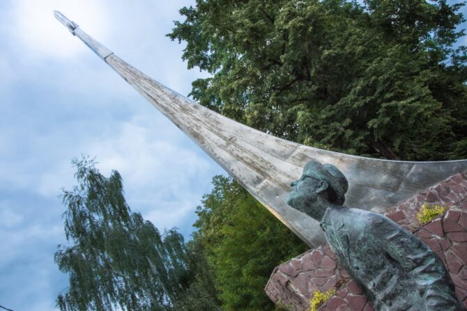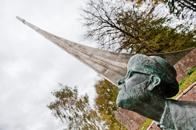 Далее дорога пройдет через сквер, где установлен памятник К.Э. Циолковскому. Скульптурная композиция появилась в парке в 2007 году как раз к 150-летию основателя российской космонавтики. Ранее здесь стоял бронзовый бюст ученого, который сильно пострадал от вандализма в конце 80-х годов. Психически больной житель города дважды сносил ему голову. В результате было принято решение убрать бюст из сквера. Несколько лет спустя благотворительным фондом «Диалог культур – единый мир» была создана инициативная группа и собраны средства на восстановление памятника. В качестве замены бюсту была выбрана уменьшенная копия московской монументальной группы, посвященной космонавтике. Композиция скульптора С.Ю. Бычкова оказалась настолько органичной, что ее аналоги установлены не только в Москве и Боровске, но и в австралийском Брисбене. Его установили в тот же юбилейный 2007 год возле городского планетария. Двухуровневая композиция включает верхнюю часть в виде взлетающей ракеты, и нижнюю, где сидит мечтающий о космосе ученый.