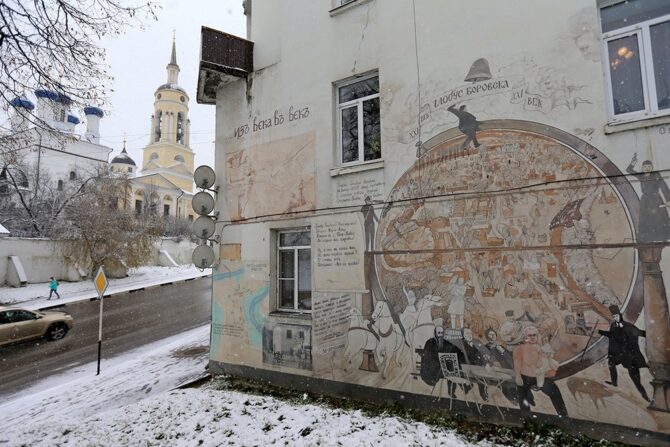 Путешествуя по Боровску, туристы обращают внимание на расписанные интересными граффити стены и заборы. Это творчество местного художника Владимира Овчинникова (1938 г.р.). Он решил языком рисунка рассказать гостям о жизни и истории провинциального городка. Получился своеобразный параллельный город, арт-галерея под открытым небом. Украшать стены старинных домов граффити энтузиаст начал совсем недавно. По специальности он инженер-строитель, но всегда увлекался художественным творчеством. После выхода на пенсию он решил рассказать собственное видение исторических и светских событий с помощью уличной росписи. Все работы сделаны с душой и хорошим вкусом. Несмотря на это, имеется масса противников творчества художника. Хотя туристам такой антураж явно по душе.