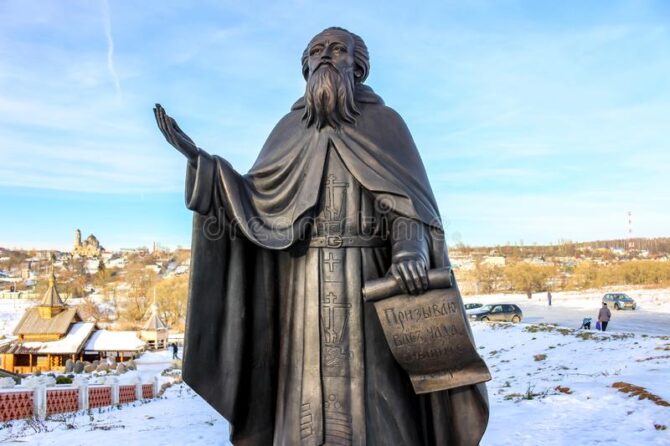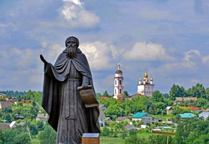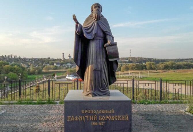 Храм Покрова Пресвятой Богородицы в Высоком был построен на территории Высоко-Покровский монастырь. В 1414 году сюда пришел преподобный Панфутий и в течение 20 лет являлся его иноком. В 1444 году он ушел из обители, чтобы основать новый монастырь на реке Истерьме. В память о нем в 2016 году был установлен памятник. Автором скульптуры стал Алексей Леонов. Заказчиком стал международный фонд «Диалог культур – единый мир», который оплатил работу и подарил скульптуру горожанам.