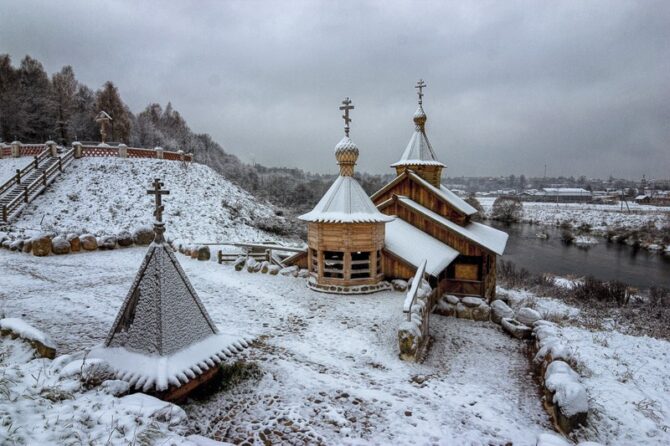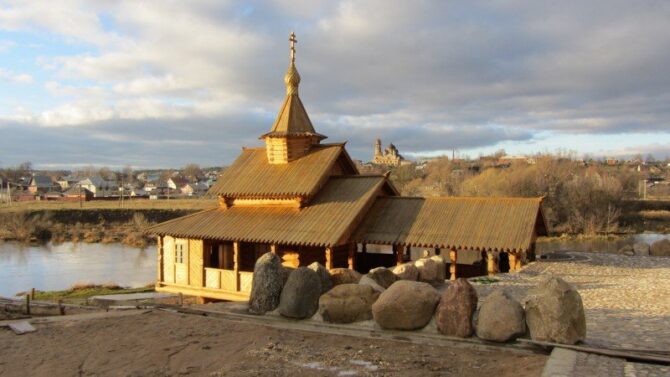 Сквер, расположенный рядом с мастерской, не привлечет особого внимания. В нем установлен небольшой памятник Юрию Гагарину, затем стоят несколько административных зданий. Вот как раз за ними есть еще один интересный объект. Это Мемориальная часовня в честь боярыни Морозовой, княгини Урусовой и иже с ними, пострадавшим за веру в 17 веке. Здание построено в неорусском стиле в начале 2000-х годов. Но это не просто храм. Это часть маршрута, ведущего «по стопам старообрядческих мучеников». Если не знать историю гонений за веру, то данный объект станет лишь очередным архитектурным сооружением по пути изучения Боровска. Сюда рекомендуется приходить с гидом или присоединяться к экскурсионной группе. Можно узнать массу интересных фактов. Часовня входит в Крестный ход Верея – Боровск, который проводится ежегодно. У местных старообрядцев ест свой сайт: http://rpsc.ru/church/borovsk/.