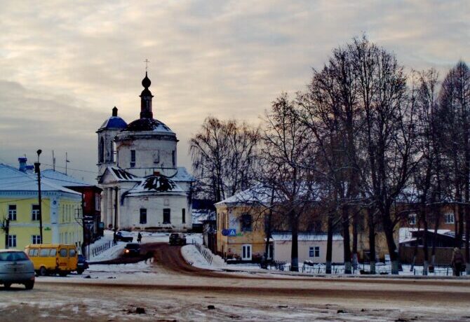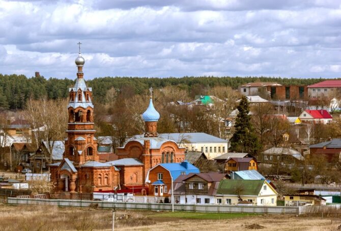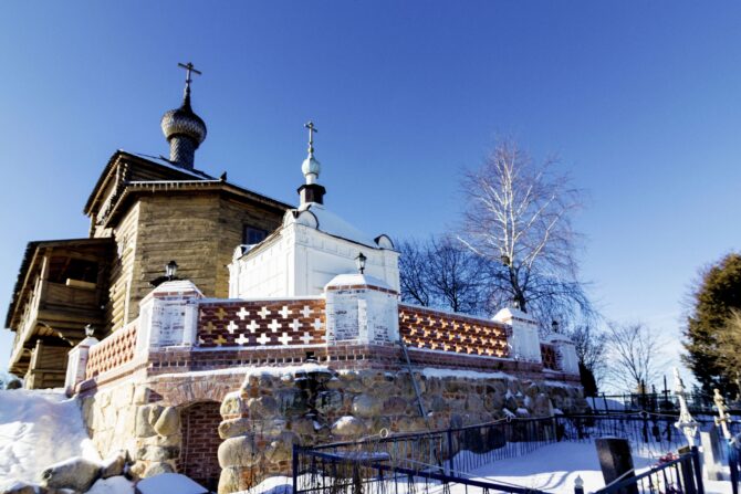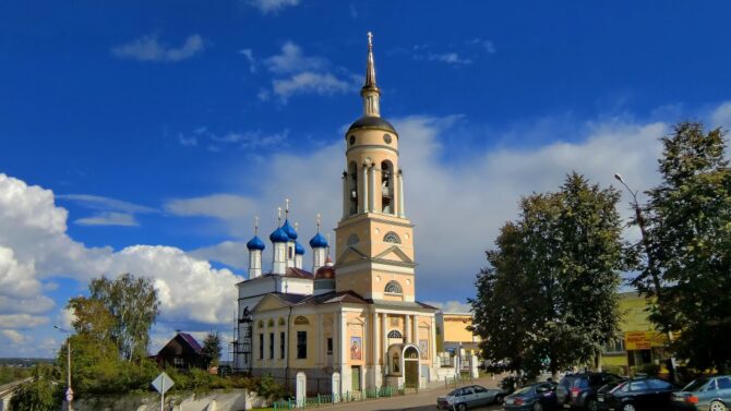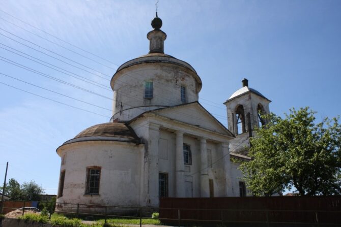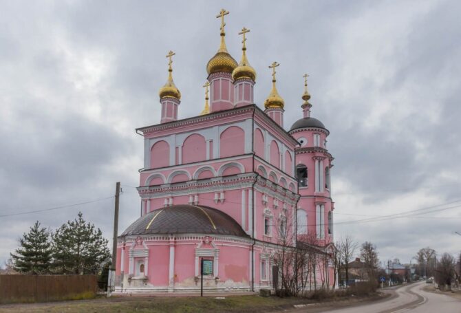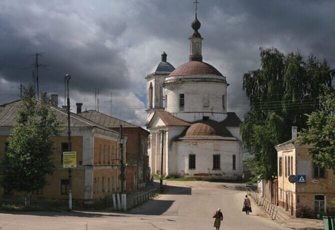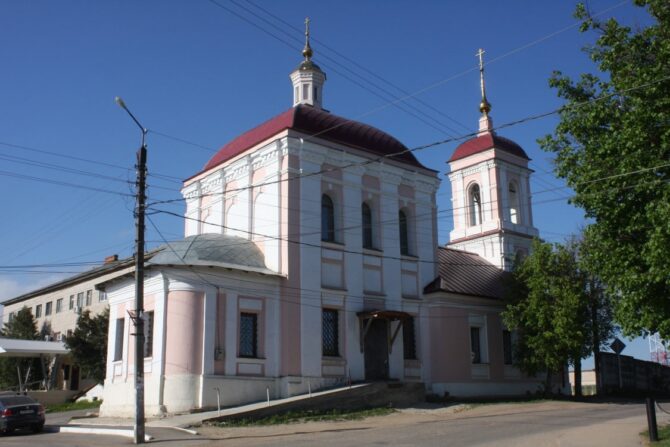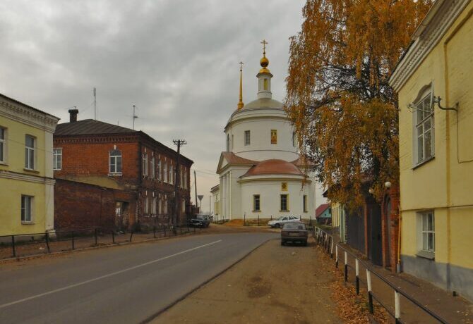 По улице, созданной одно и двухэтажными старинными особняками, можно дойти до Храма Воздвижения Честного Креста Господня. Первое письменное упоминание о нем появилось в 1650 году. Деревянные церкви постоянно грели во время пожаров, но вновь восстанавливались. Так продолжалось вплоть до 1800 года, когда рядом с очередным деревянным зданием начали строить каменный придел. Его достроили только к 1814 году на пожертвования прихожан. Со временем были отстроены жилые помещения для служителей церкви, к 1914 году к храму были приписаны часовня преподобного Панфутия и церковь Покрова в Высоком. В 1925 году храм закрыли, а помещения передали под нужды машинно-тракторной мастерской. В годы войны в здание попал боевой снаряд, а южный фасад пострадал от пулеметного обстрела. После войны восстанавливать здание не стали, а приспособили его под водонапорную башню. В начале 90-х начались восстановительные работы. С 2014 года храм вновь стал действующим.