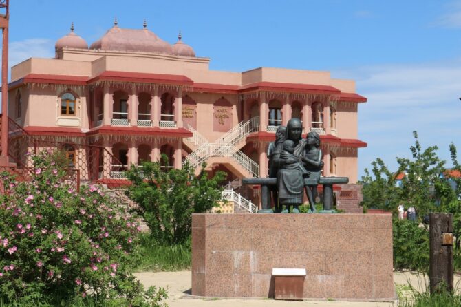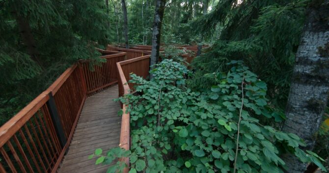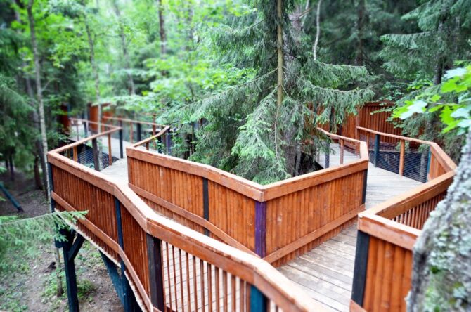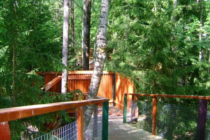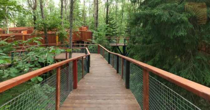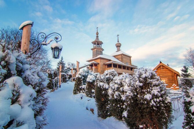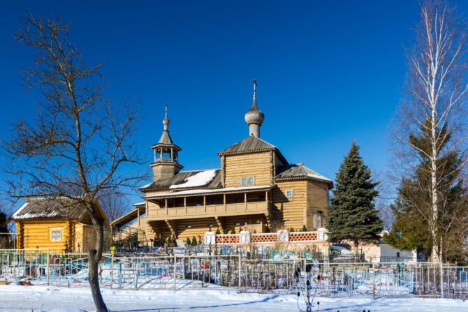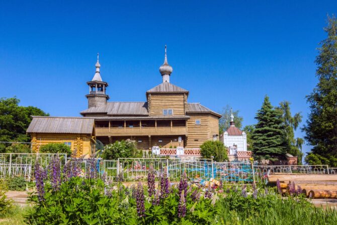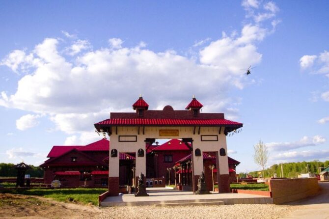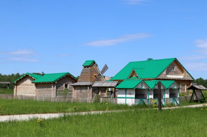 Дальше нужно ехать в сторону деревни Петрово. Здесь находится парк-музей «Этномир». Его большая территория (140 га) предназначена для экскурсий, прогулок по свежему воздуху, здорового и активного отдыха вдали от городского шума, загазованности и суеты. Здесь можно остановиться на несколько дней или провести отпуск. Для проживания построены эко-отели, соответствующие мировым стандартам комфортности. Проект задуман, как создание на единой территории парка из этнокультур разных народов мира. На каждом подворье открыты ремесленные мастерские, в которых кипит работа по производству кустарных изделий, сувенирной продукции, проводятся мастер-классы. Неотъемлемой частью являются рестораны с аутентичной кухней. Отели представлены в виде русского подворья с избами, украинских мазанок, казахстанских юрт, чукотских чумов. Есть гималайский и непальский дома. Для желающих почувствовать себя раджей построен индийский дворец.