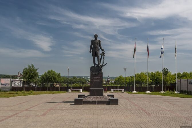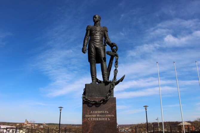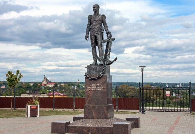Сразу за собором находится площадь с памятником адмиралу Дмитрию Николаевичу Сенявину. Он родился в деревне Комлево недалеко от Боровска в 1763 году. Потомок известного дворянского рода, он пошел по стопам предков, и в 10-летнем возрасте поступил на службу в Морской кадетский корпус. Он дослужился до чина адмирала флота, участвовал в многочисленных морских сражениях и войнах. Он стал легендой русского флота. Его могила находится в Благовещенской церкви Александро-Невской Лавры в Санкт-Петербурге. В Боровске, малой родине флотоводца, к его 250-летию был установлен памятник.