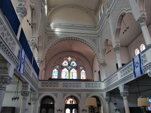 Синагога была построена между 1899 и 1901 годами в неоготическом стиле с мавританскими чертами.