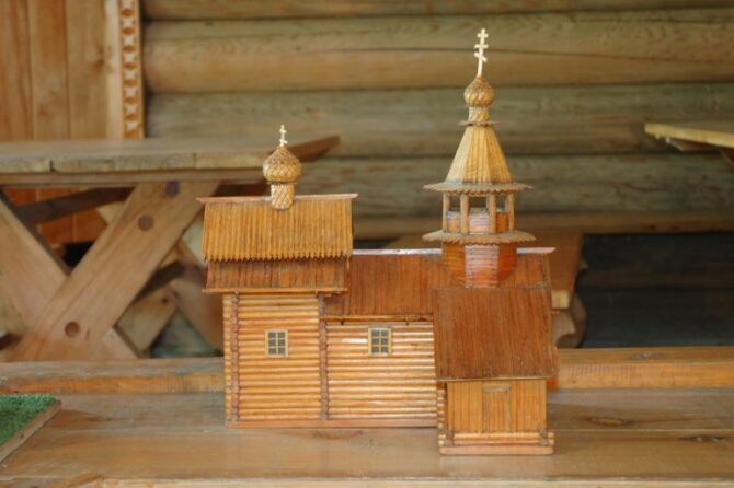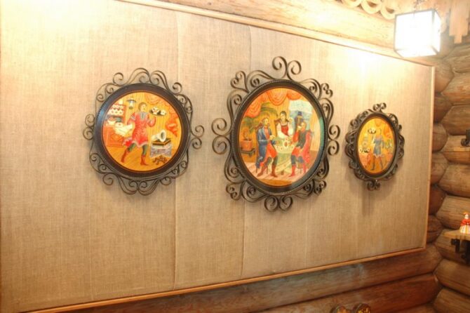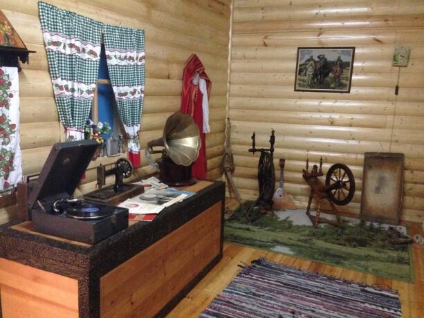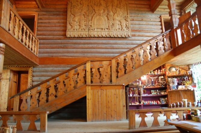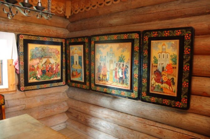 - Владимирскую светлицу, представляющую собой здание с прочными стенами, собранными из рубленых бревен; свет внутрь деревянного сооружения проходит через небольшие окна, на которых висят красивые льняные занавески с рисунками; на длинном столе, сервированном фарфоровым сервизом, возвышается самовар; стены украшены изящными стеклянными и лаковыми миниатюрами;