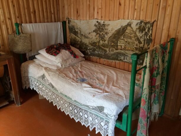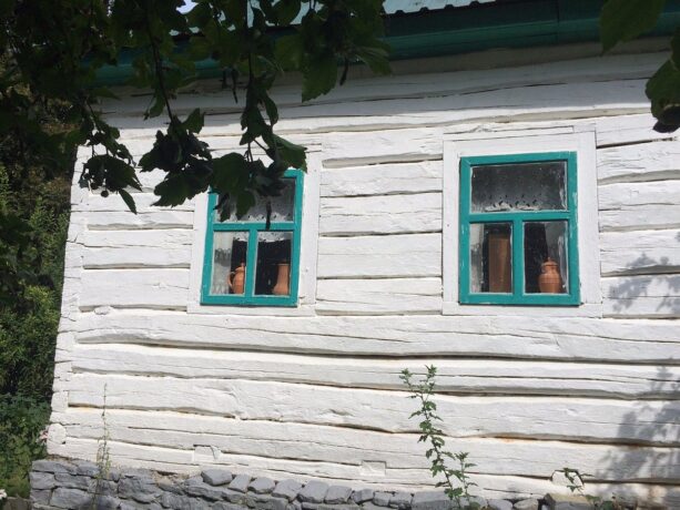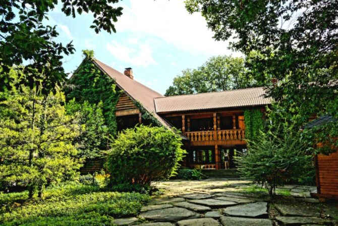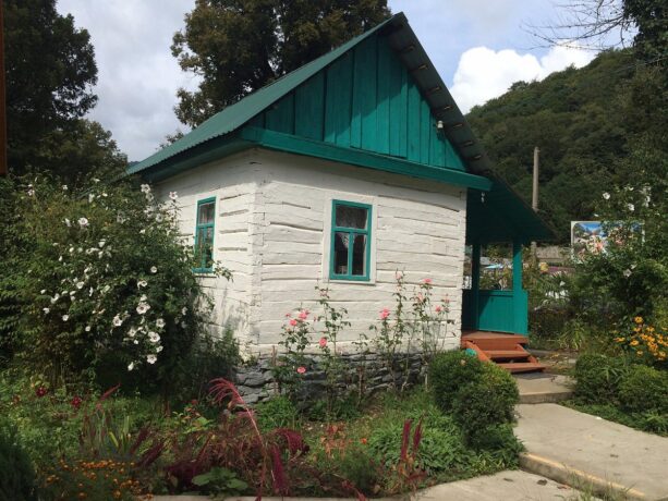 - главный деревянный дом, построенный в 1972 г. гуцульскими мастерами; фасад украшен изящной резьбой; здание состоит из двух изб – хозяйской и людской, – соединенных крытым двором;