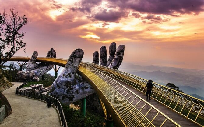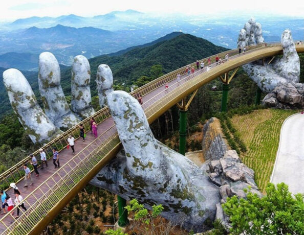 Путешествие в Дананг у многих ассоциируется с посещением удивительного Золотого моста — визитной карточки, пожалуй, всего Вьетнама. Он построен на утесе горы Ба На. Со стороны кажется, что конструкцию моста поддерживает кто-то невидимый. Местные называют мост также “Прикосновение к небу”, и такое определение ему очень подходит.