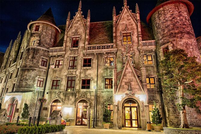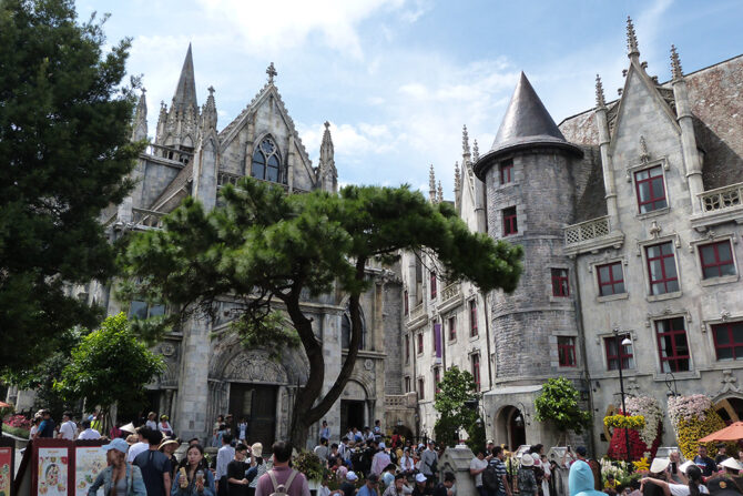 Во Французской деревне есть дома, площадь с фонтаном, магазины, храмы и рестораны с закусочными. Все создано в камне и дереве. Место очень красивое, и кажется, что находишься в средневековой Европе. Ежедневно после обеда на площади гостей встречают актеры в костюмах для фотосессий, сюда в том числе специально приезжают свадебные кортежи.