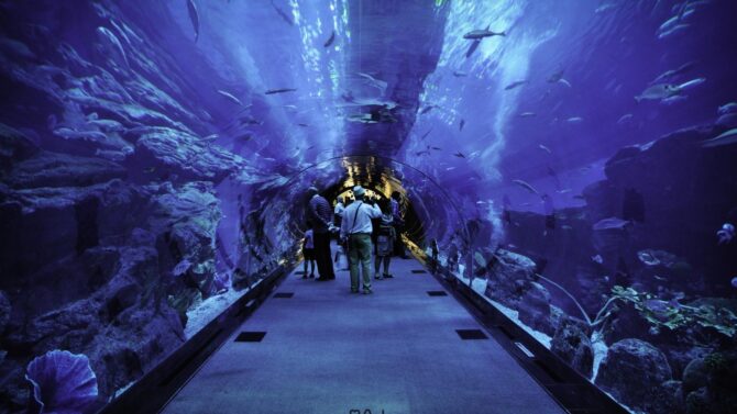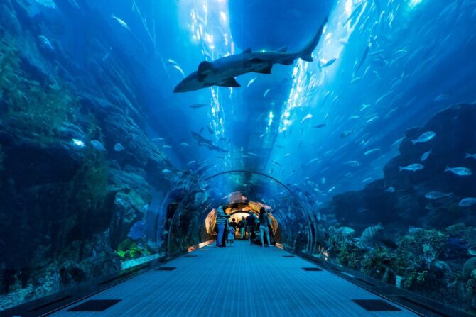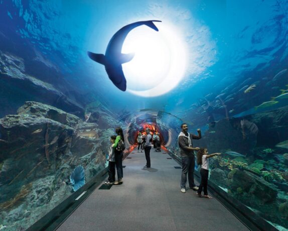 Аквариум Дубая поделен на две зоны. В одной из них плавает большое количество морских хищников. Для самых бесстрашных посетителей здесь есть услуга – погружение в клетку, чтобы покормить акул. Во второй зоне морская фауна не так разнообразна, но тоже очень интересна. В основном ее посещают туристы с детьми.