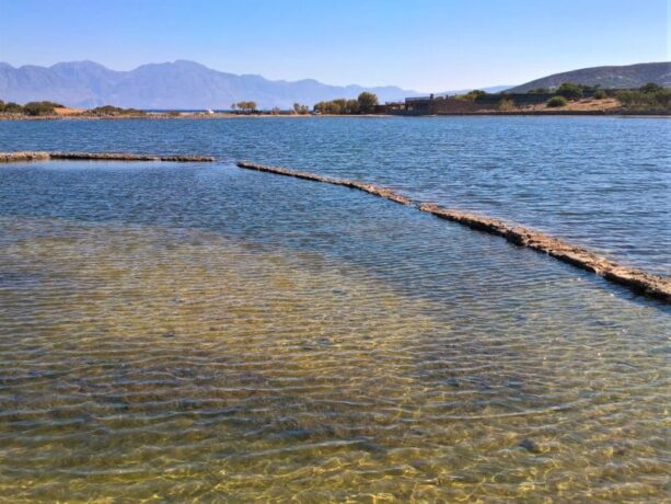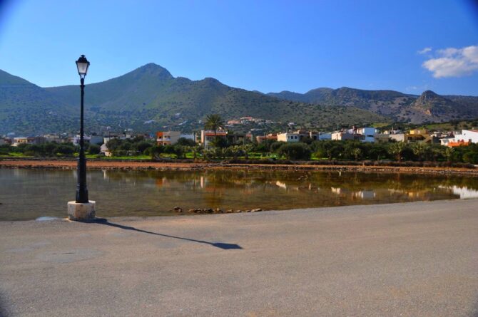 На мелководье вдоль побережья залива Мирабелло в глаза бросаются каменные ограждения отдельных участков воды. Сначала их принимают за руины утонувшего города Олус. На самом деле это искусственные резервуары для забора соли. Морская вода за лето испарялась и в них оставалась соль, которую осенью собирали и увозили в находящиеся в деревне склады. Соль здесь начали добывать венецианцы в 15 веке. Благодаря защищенности от ветров, укрепленной крепости на Спиналонге им удавалось вплоть до начала 1700-х годов удерживать этот участок, не позволяя захватить его туркам. Элунда снабжала солью большую часть Европы. В начале 20-го века, когда Греция и Крит объединились, страна долгое время удерживала монополию на добычу и продажу соли в Европе. Солончаки разрабатывались до 1975 года, затем были заброшены. Элунда стала превращаться в модный курорт, поэтому местное население решило зарабатывать на туристах. Сегодня производство соли пытаются наладить, но технологии оказались безвозвратно разрушены. Возле оставшихся резервуаров установлены таблички с запретом ловли рыбы и купания.