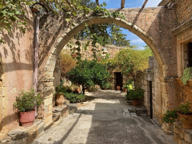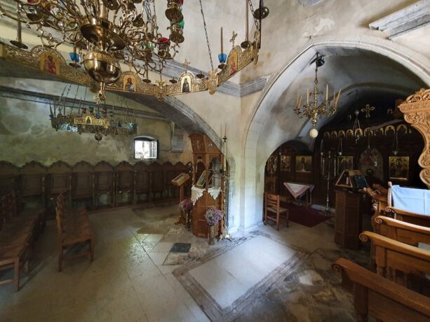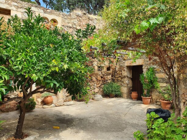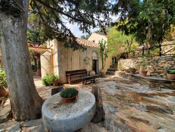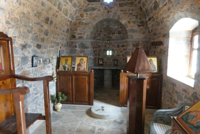 Старинный монастырь Agios Ioannis Prodromos находится в горах. Никто точно не знает, когда здесь собрались иноки и основали эту обитель. Все постройки выполнены из камня, двор обнесен невысокой кладкой. В одной из сторон монастырь полностью закрывает отвесная скала. Вход в храм красиво оформлен двумя полуколоннами, возле окон посажены вечнозеленые кустарники. Помещение для богослужений небольшое. Под сводчатым потолком установлен невысокий двухуровневый иконостас, молитвенник, на стенах отсутствует роспись. С открытой галереи открывается вид на море, мыс и горы, покрытые растительностью, бухту и остров Спиналонга. Растениями в керамических горшках украшена вся территория монастыря. Они стоят возле храма, келий, по всей смотровой галерее, возле лестниц.