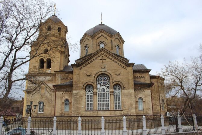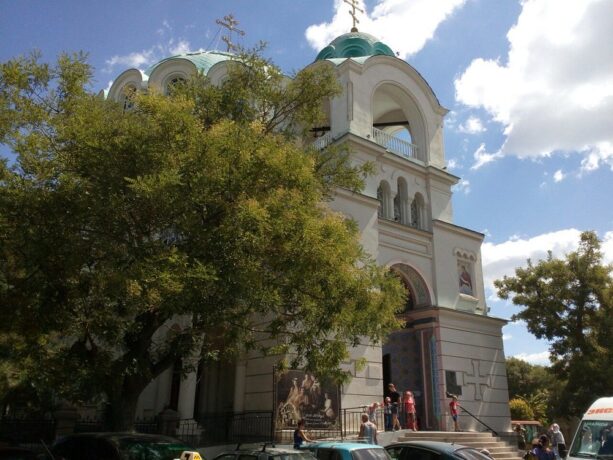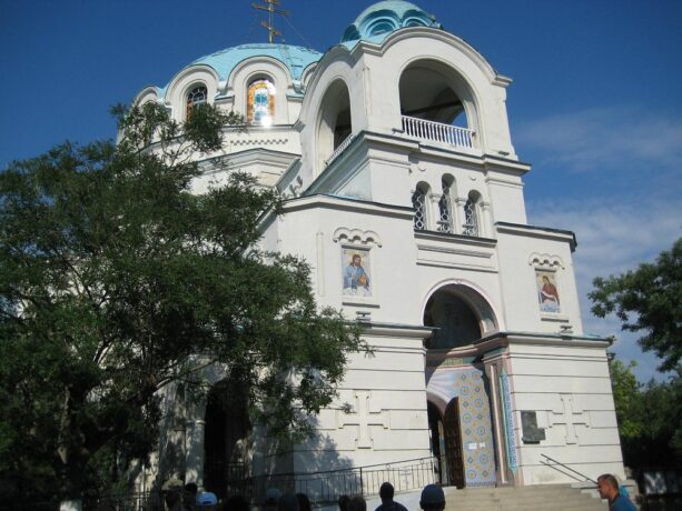 Автор грандиозного храма – И. Бернадацци, потомственный архитектор швейцарского происхождения. В мае 1916 г. Николай II со своей семьей посетил собор во время пребывания в Евпатории. Роспись стен и купола внутреннего зала была выполнена крымскими мастерами. Храм, вмещающий одновременно до 2 тыс. прихожан, включает в себя три престола.