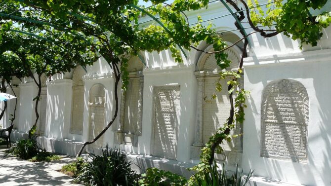 - высокие белые стены, украшенные нишами с иконами и барельефами в форме крестов;