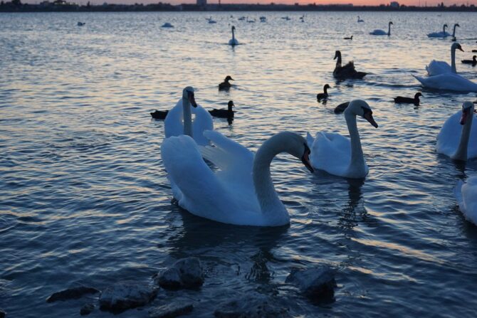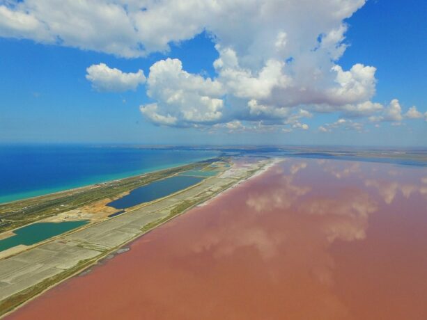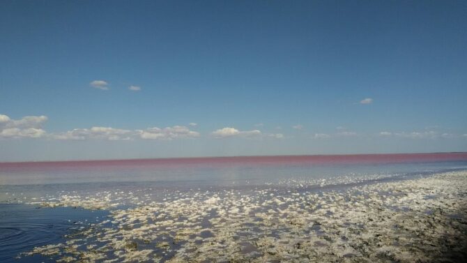 Июли и август – месяцы, когда любители крымской природы стремятся побывать на живописном озере, расположенном к востоку от Евпатории. В этот период Сасык-Сиваш, что можно перевести как «зловонная грязь», поражает красками. В зависимости от времени суток и погоды, поверхность озера меняет цвет: