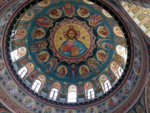 - высокий синий купол (диаметр – 18 м), украшенный православным крестом;