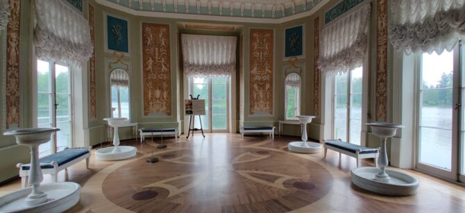 За несложными фасадами утаивались богатство и роскошь. Картины и позолоченные украшения, множество зеркал придавали внутреннему убранству особенный праздный вид. Этот контраст всегда поражал современников, так как незначительный павильон становился внезапным сюрпризом для посетителей, прогуливающихся по Гатчинскому парку.